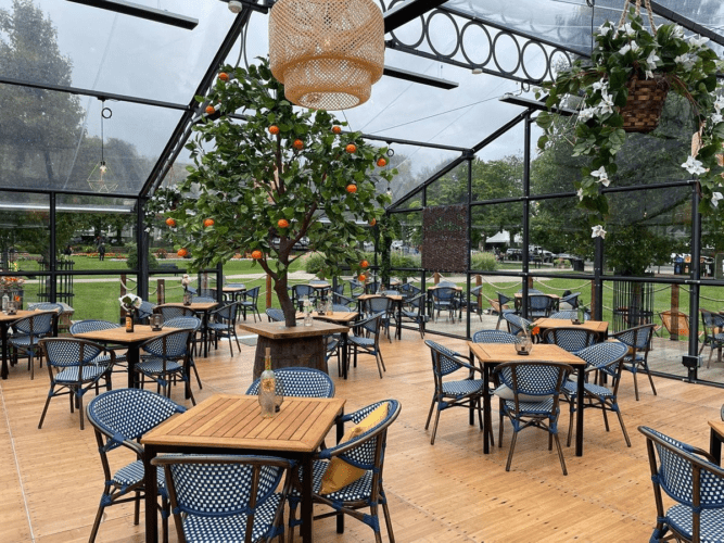 Deux magnifiques orangeries de Cheltenham avaient besoin d’une solution de chauffage : The Garden Bar et Pittville Pump Room. Situé dans les Imperial Gardens, à côté de l’hôtel de ville de Cheltenham, le Garden Bar and restaurant est une magnifique orangerie connue pour ses spécialités de café, de bière et de pizza, qui accueille également de la musique live et des événements. De même, l’Heritage Deco Cafe est un espace élégant, ouvert à tous les temps, qui donne sur le pittoresque Pittville Park. En raison de la nature d’une orangerie, lorsqu’il y a moins de soleil, l’environnement peut devenir plus froid. Les propriétaires étaient donc à la recherche d’une solution efficace qui ne nuirait pas à leur esthétique moderne et élégante, tout en gardant leurs clients au chaud.
