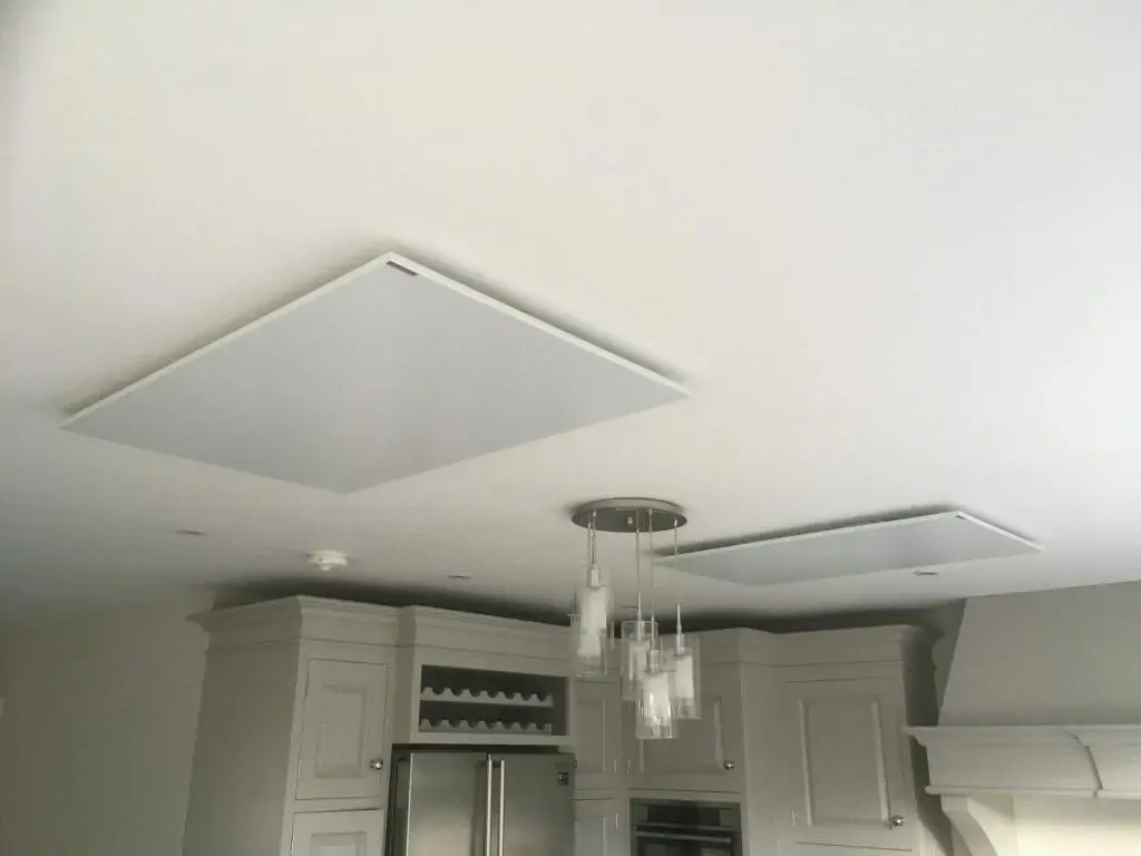 Radiateurs infrarouges pour remplacer la chaudière fioul existante, conçus avec un facteur de chaleur de seulement 25W/m3 (Vs 45W/m3 pour le système de chauffage par convection) :