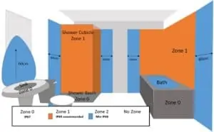 La zone 1 est la zone d’éclaboussures au-dessus d’une baignoire ou à l’intérieur d’une cabine de douche et s’étend du sol à 2,25 m jusqu’aux murs. Pour une douche, cette zone est définie par la cabine de douche, mais pour une pièce humide (pas de cabine de douche et pas de cuvette) cette zone s’étend de 1,2 m de chaque côté de la source de douche et de 2,25 m vers le haut depuis le sol. Tout appareil électrique utilisé dans cette zone doit avoir une protection RCD de 3 ma sur le circuit et IP65 ou supérieur est recommandé. Notez cependant que l’espace au-dessus de 2,25 m est « Aucune zone » et donc un panneau chauffant infrarouge IP44 peut être placé au-dessus de ces zones, par ex. au plafond tant qu’il est à plus de 2,25 m du sol au-dessus d’une zone 1.